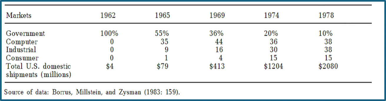 In the 1970s, the military and defense market represented over 20% of the semiconductor market, but by 1978, it had already fallen to 10%.