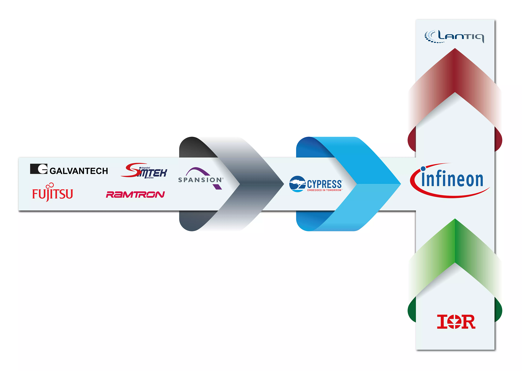 The combined Infineon portfolios position them as a top supplier in several key technologies such as power management, power discrete, microcontroller, and memory. As the diagram below shows, Infineon’s acquisitions have included many well-known and well-respected manufacturers.